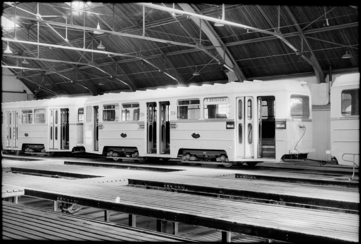 Aktieselskabet Oslo Sporveier, OS ST55 551 och 554 "Høka" i vagnhall.