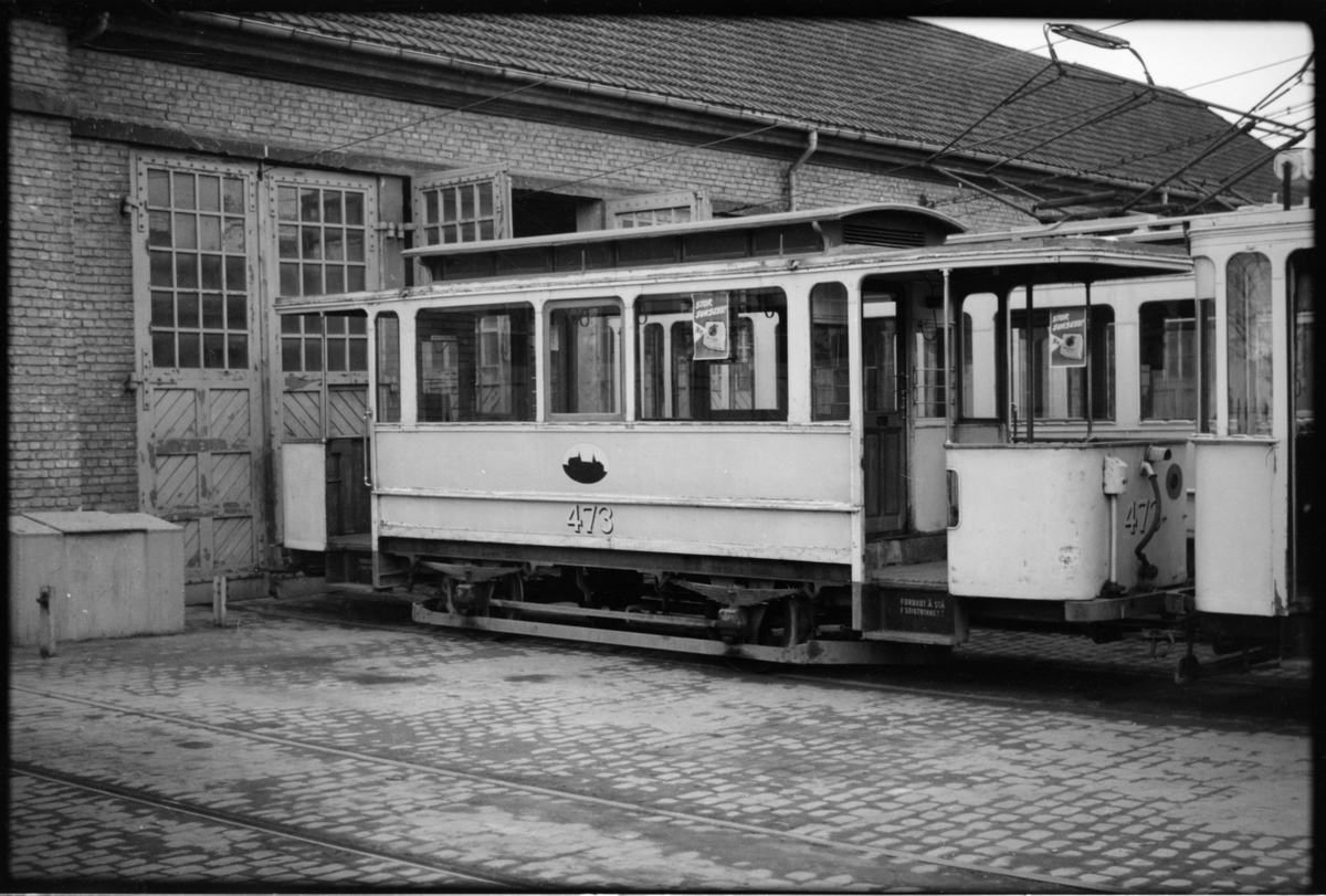 Aktieselskabet Oslo Sporveier, OS släpvagn 473 utanför vagnhall.