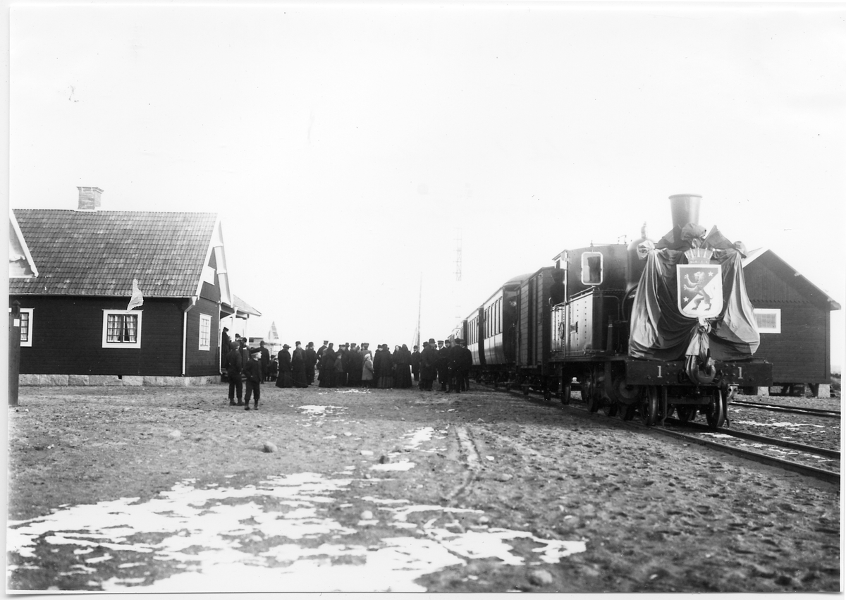 Lidköping-Kållands Järnväg LJ lok 1 "Kålland" med invigningståg vid Örslösa järnvägsstation.