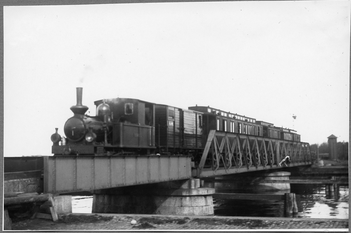 Lidköping - Skara - Stenstorps Järnväg, LSSJ lok 7 "Lidan" med tåg på stålbron i Lidköping.