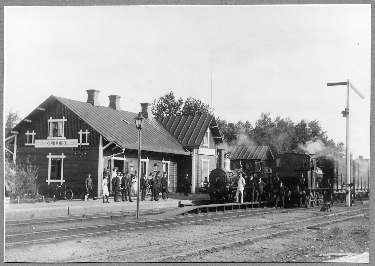 Halmstad - Nässjö Järnvägar, HNJ I 26 samt Varberg - Ätrans Järnväg, WbÄJ lok, med varsitt tåg inne på stationen i Kinnared.