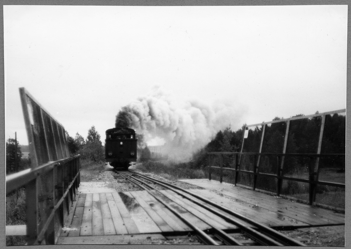 Bakgående ånglok passerar viadukten över Östkust banan mellan Åbydal och Hamrångefjärden. Dala - Ockelbo - Norrsundets Järnväg, DONJ lok 12.