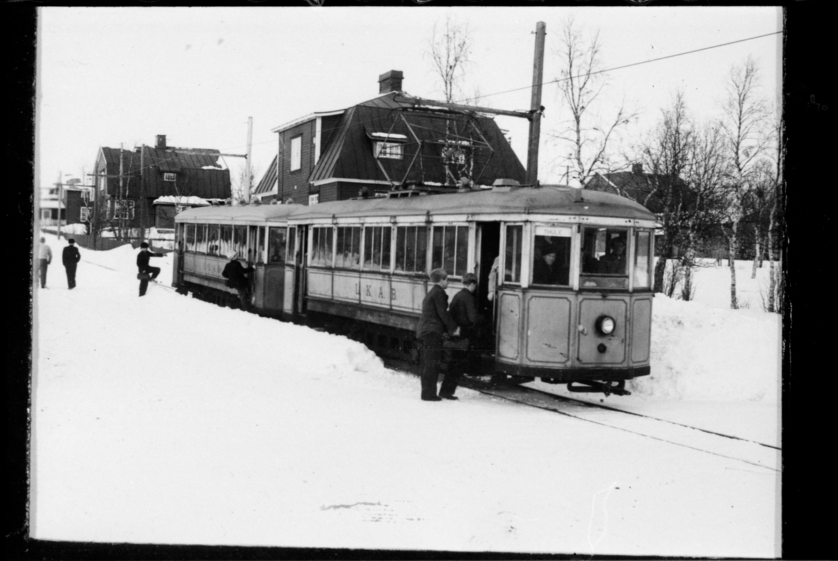 Luossavaara-Kiirunavaara Aktiebolag, LKAB spårvägståg med resande på Thulelinjen.
