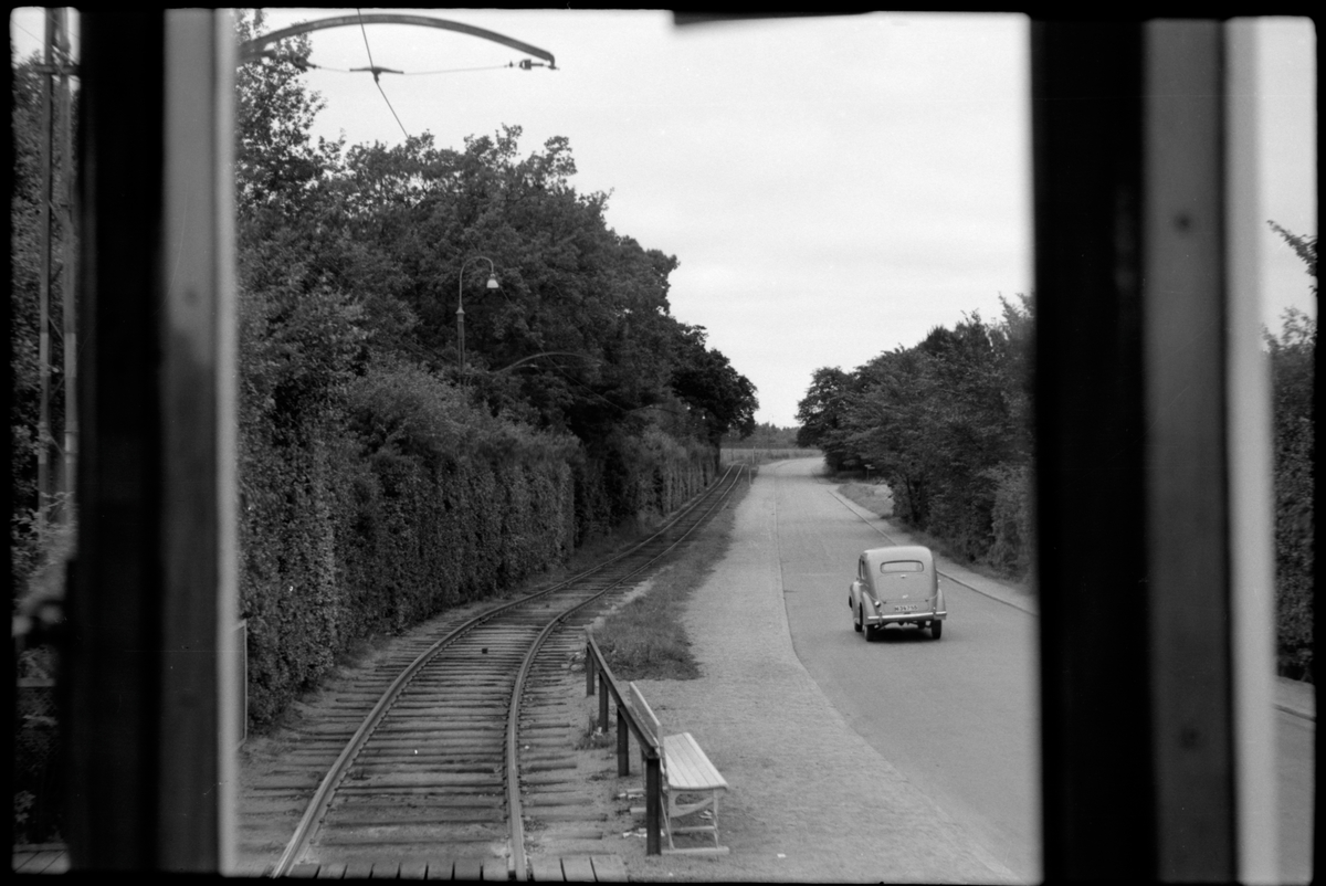 Helsingborgs Stads Spårvägar, HSS spårväg vid Romares väg norrut. Väganslutningen från höger är Lannerstjernas väg. Till vänster i bild bakom träden skymtar Krematoriet.