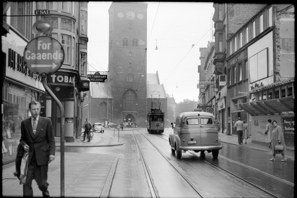Bilden är tagen från Store Torv sett genom Borgporten från Lille Torv . Framför domkyrkan längst ner i bild ses Århus Sporveje, ÅS spårvagn 1.