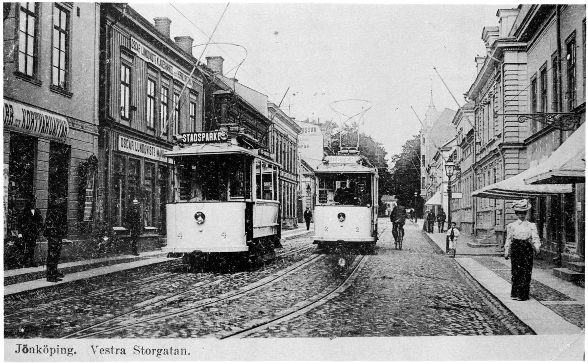 Jönköpings Spårvägar, JS spårvagnar 4 och 2 på Västra Storgatan mot väster. Bakom vagn 2 syns växeln till spåret mot Barnarpsgatan och där bortom upphör mötesspåret.