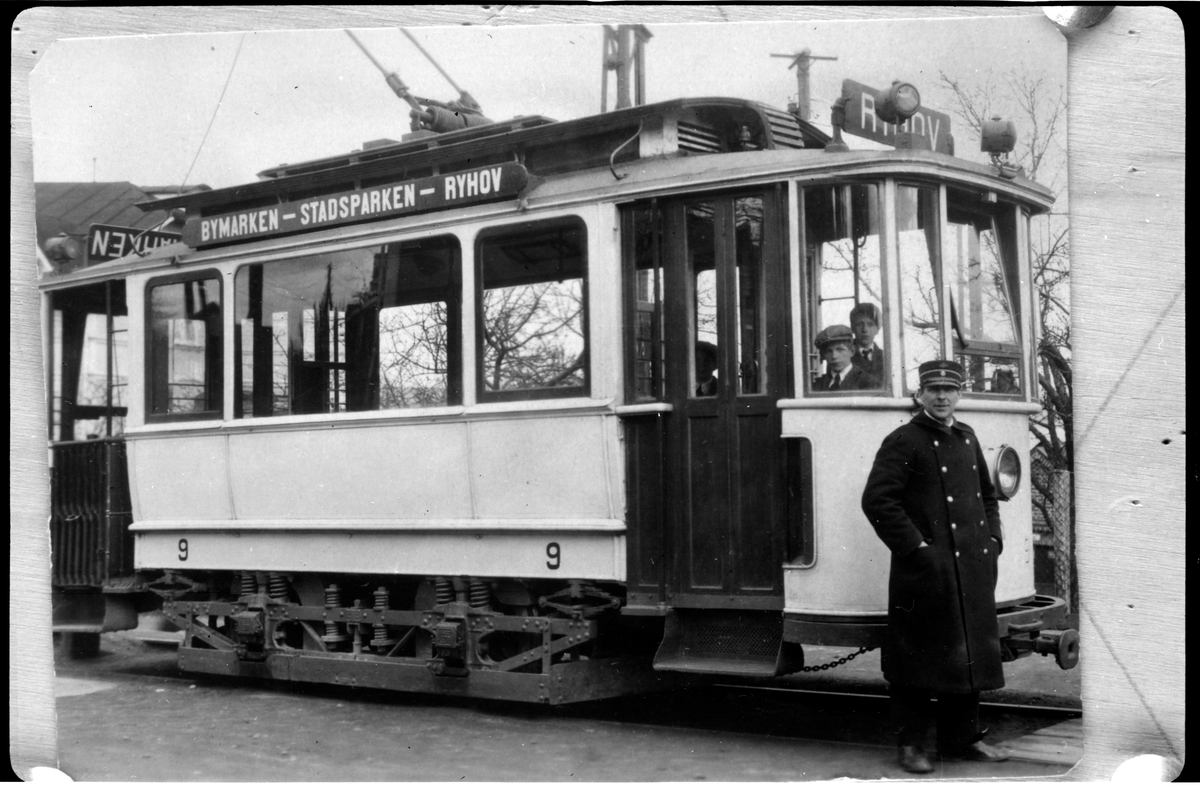 Förare Johan Hansson utanför Jönköpings Spårvägar, JS spårvagn 9. Barn ses i hyttfönstret.