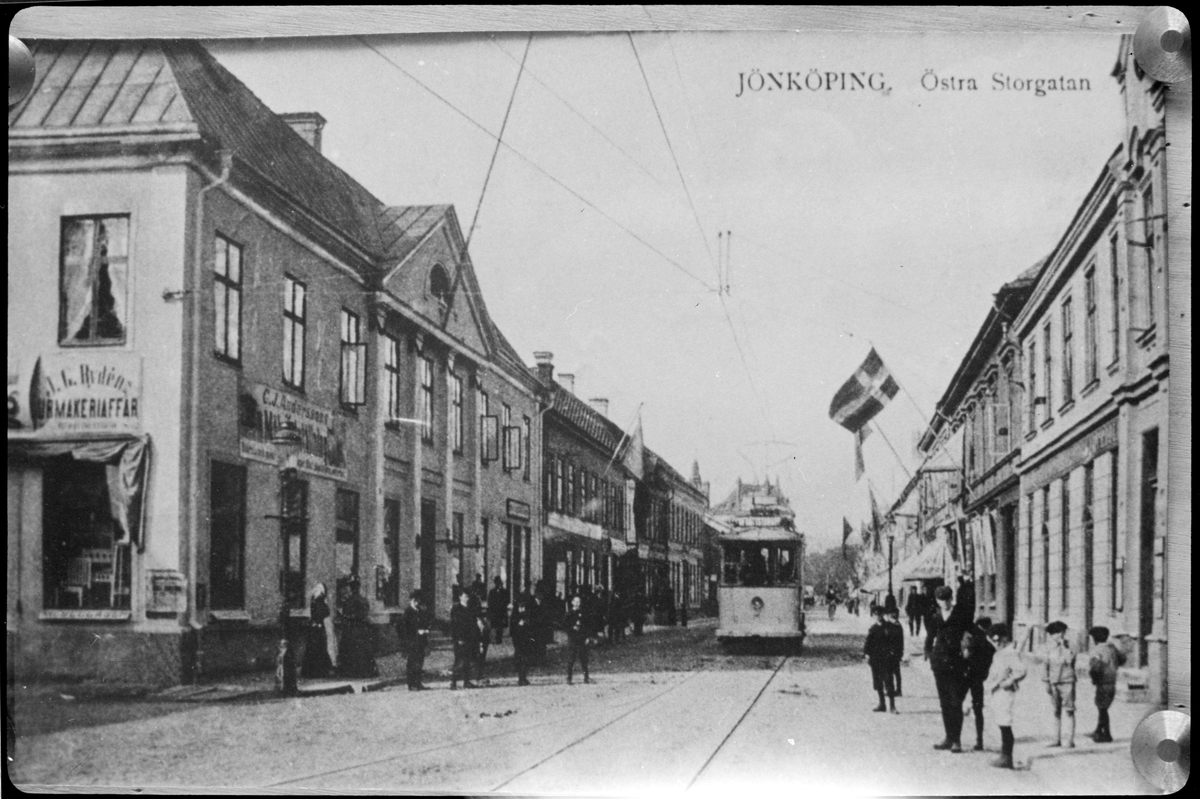 Jönköpings Spårvägar, JS spårvagn i trafik på Östra Storgatan, Jönköping.