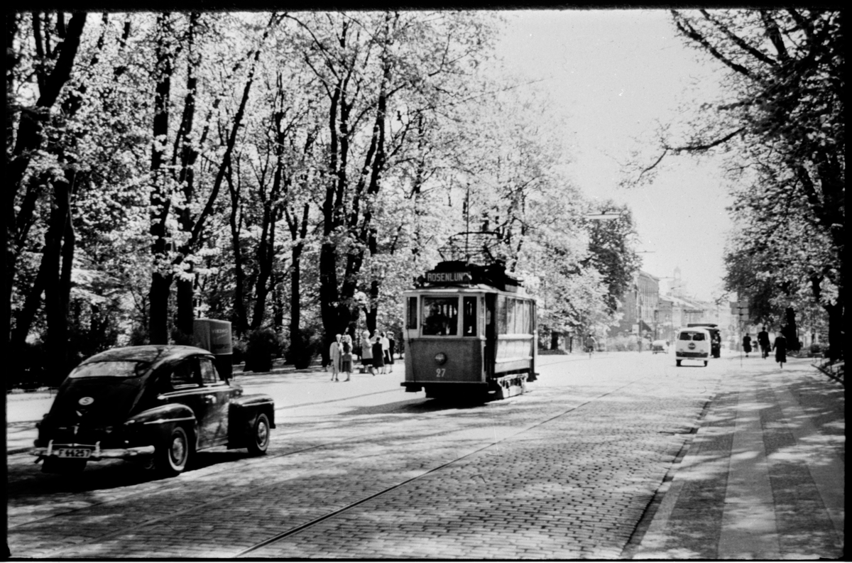 Jönköpings Spårvägar, JS spårvagn 27 i trafik på Västra Storgatan i Rådhusparken.
