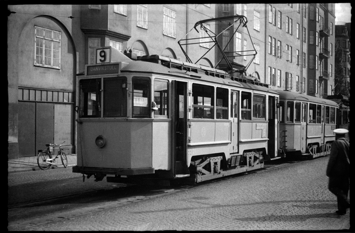 Aktiebolaget Stockholms Spårvägar, SS A4 "jitterbugg" 21 vid hållplats på linje 9. En linje som trafikerade mellan Karlberg - Slussen - Danvikstull.