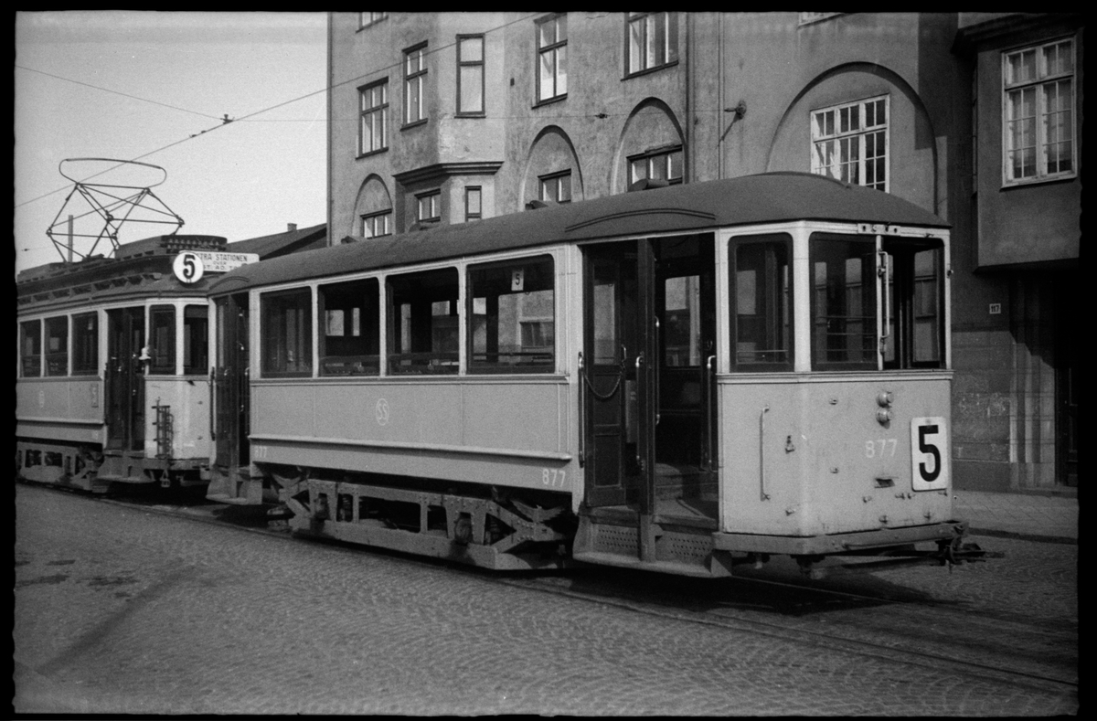 Aktiebolaget Stockholms Spårvägar, SS B20 877 kopplad med A11 19 på linje 5 mellan Karlberg och Östra Station.