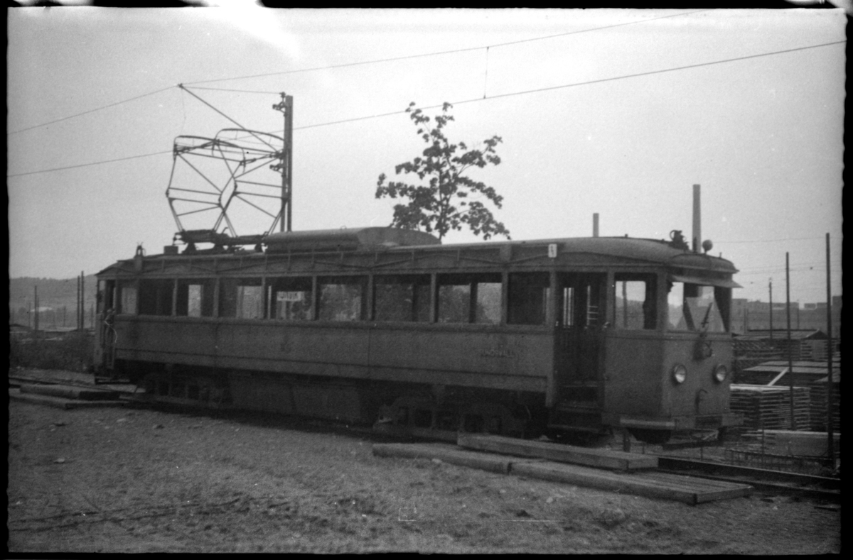 Spårvagn tillhörande Spårvagnsaktiebolaget Sundsvall - Skönvik, SSS, står på spåret vid Tunadals sågverk.