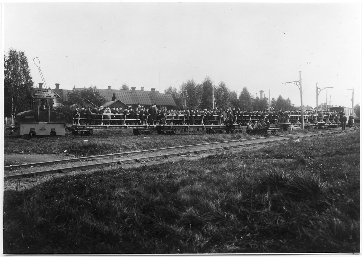 Titel: Kvarnsvedens Pappersbruk ellok "Herman Bohrman" med 5 öppna boggieflakvagnar med soffor.