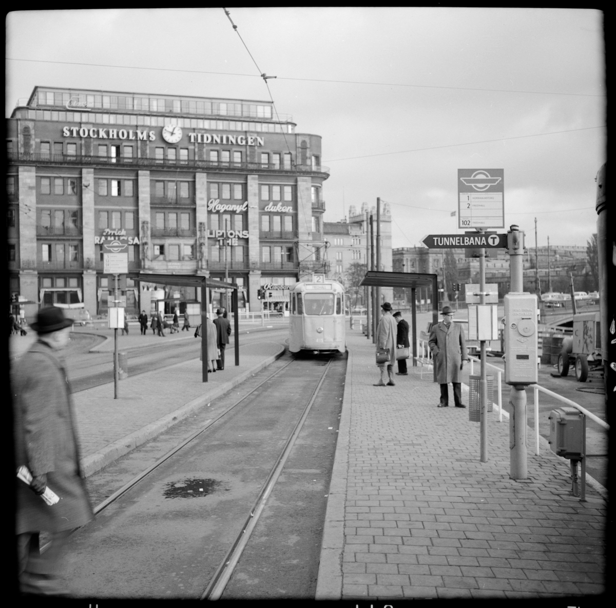 Aktiebolaget Stockholms Spårvägar, SS A25 415 "mustang" linje 2 Fredhäll - Karlaplan på hållplats vid Tegelbacken sydligaste spåret.