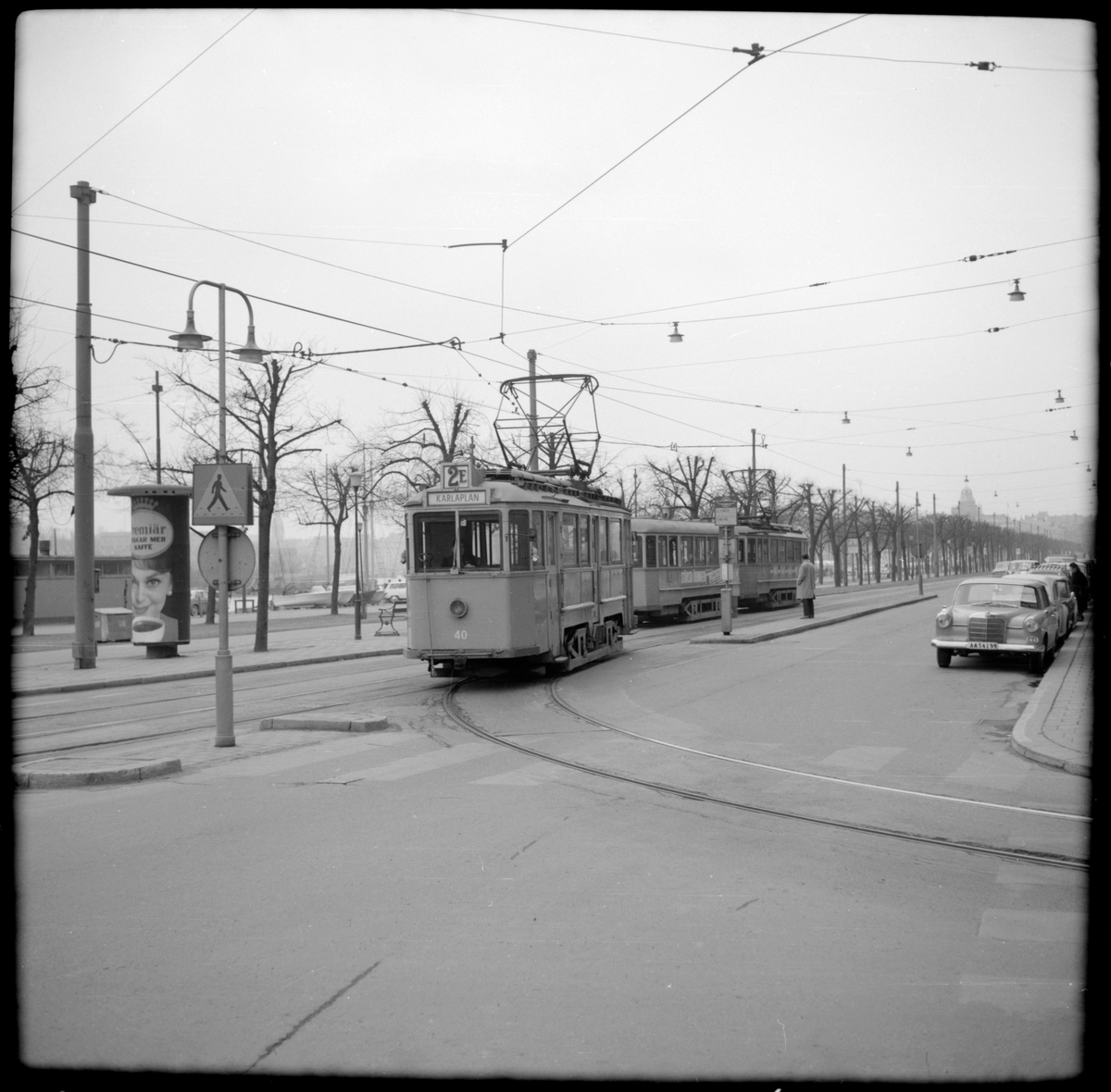 Aktiebolaget Stockholms Spårvägar, SS A4 40 "jitterbugg" linje 2 Fredhäll - Karlaplan. Extravagnen svänger in på Narvavägen från Strandvägen.