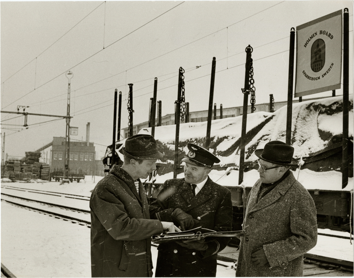 diskuterar lastningsfrågor med från vänster utlastningsförman Rune Tingsborg och planeringsman Weine Seger vid Holmens Bruks fiberplattfabrik".