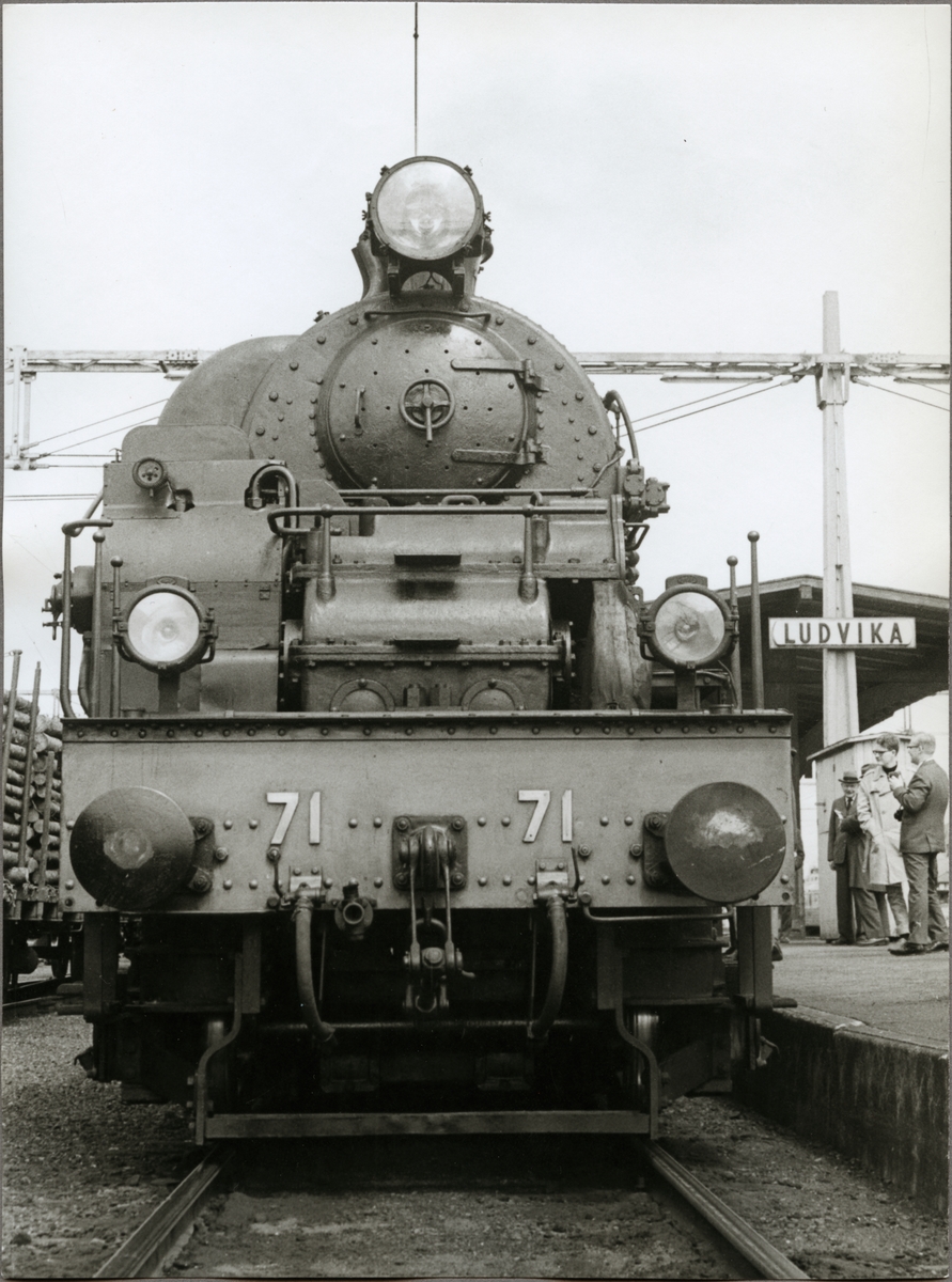 Tåget, med Trafikaktiebolaget Grängesberg - Oxelösunds Järnvägar, TGOJ M3t 71 i täten, gör uppehåll på Ludvika station.