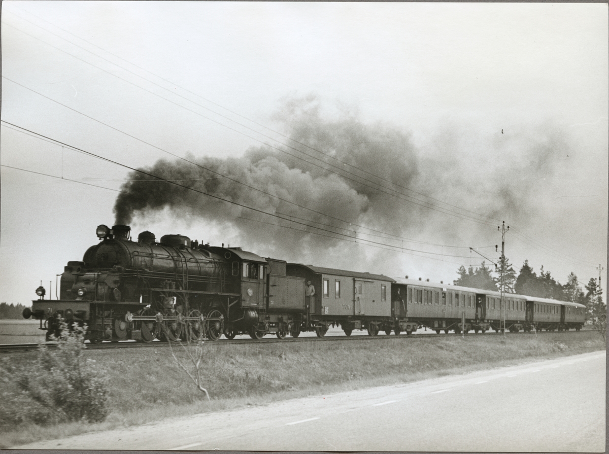 Tåget, draget av Trafikaktiebolaget Grängesberg - Oxelösunds Järnvägar, TGOJ M3t 71 efter linjen.