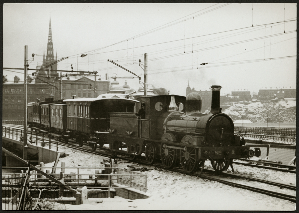 Oxelösund - Flens - Västmanlands Järnväg, OFWJ A 8 med vagnar på linjen mellan Stockholm C och Norrström på parad 1 december 1956.