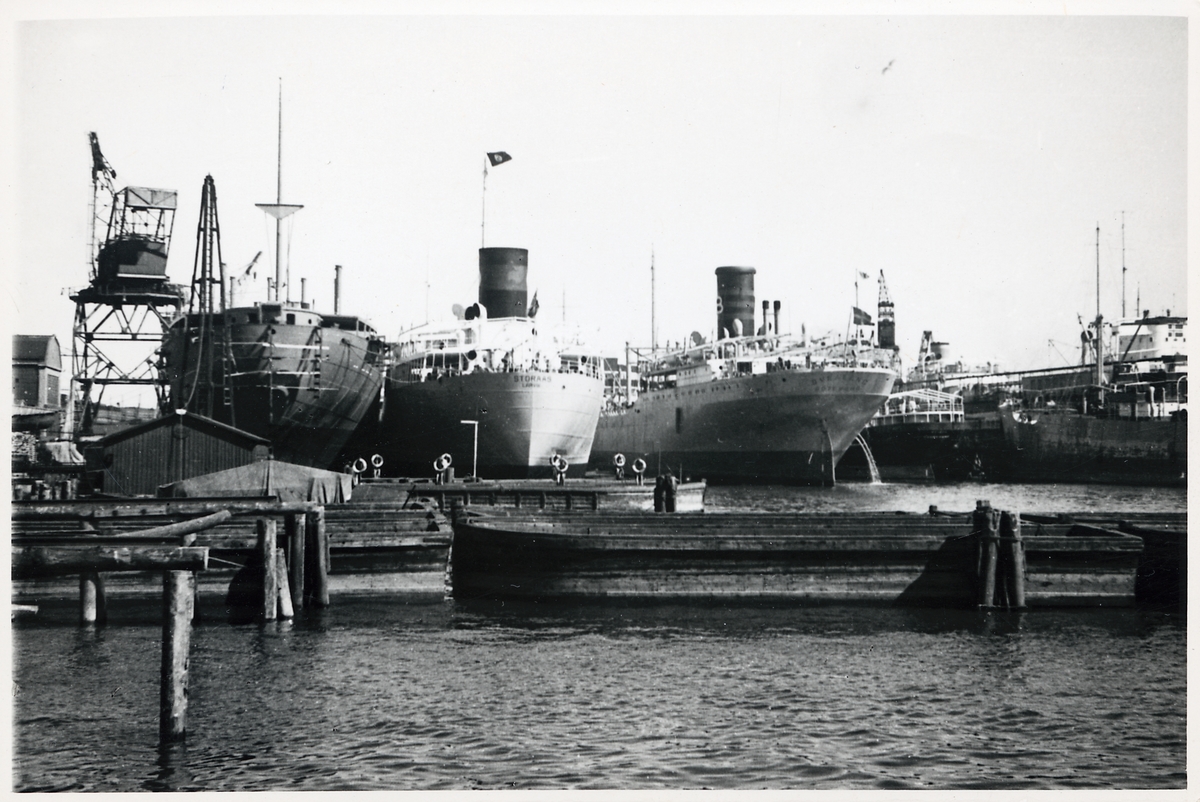 Titel: Hamn miljö. Andra fartyget från vänster heter Storaas Larvik.
