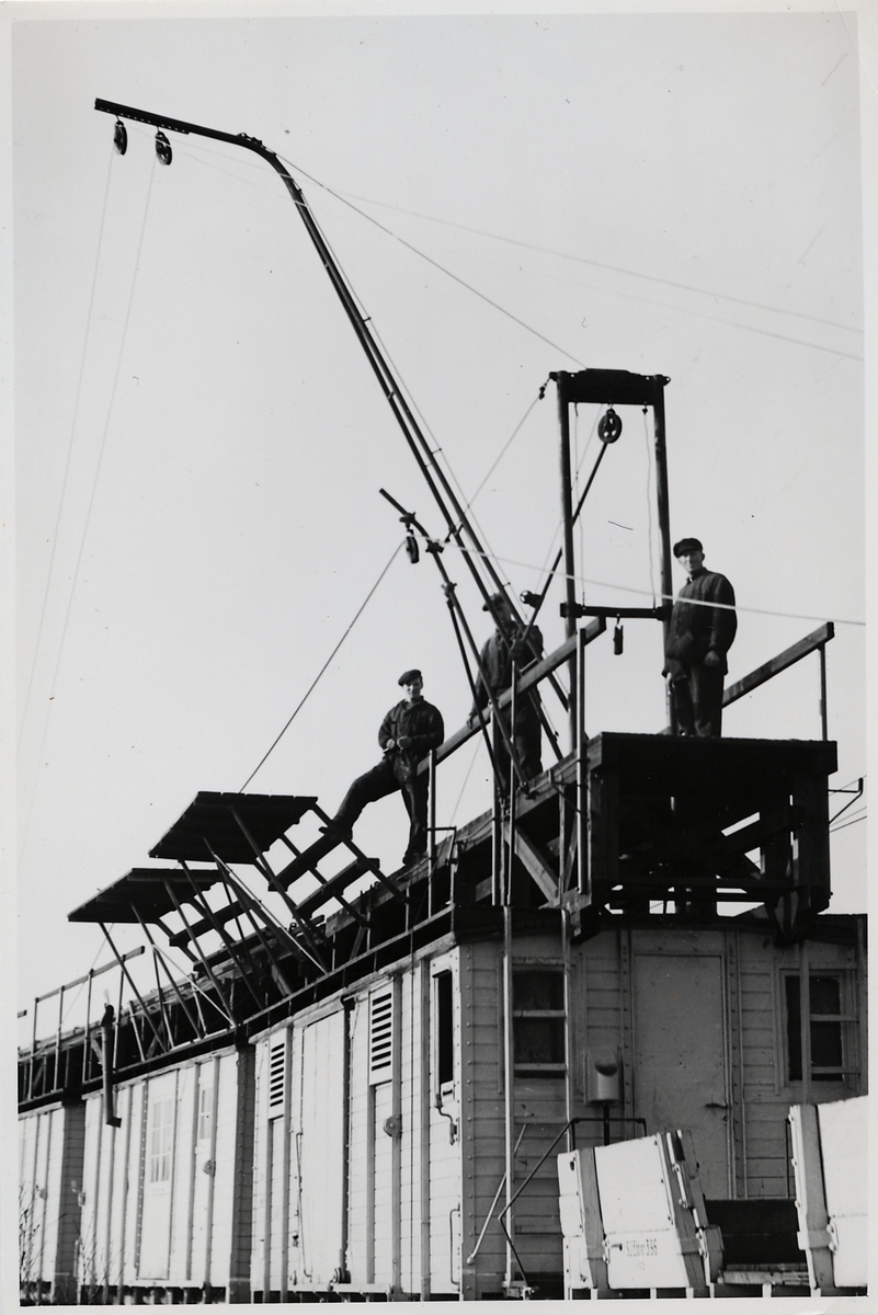 Titel: Personal utför elektrifieringsarbete på ett montagetåg.