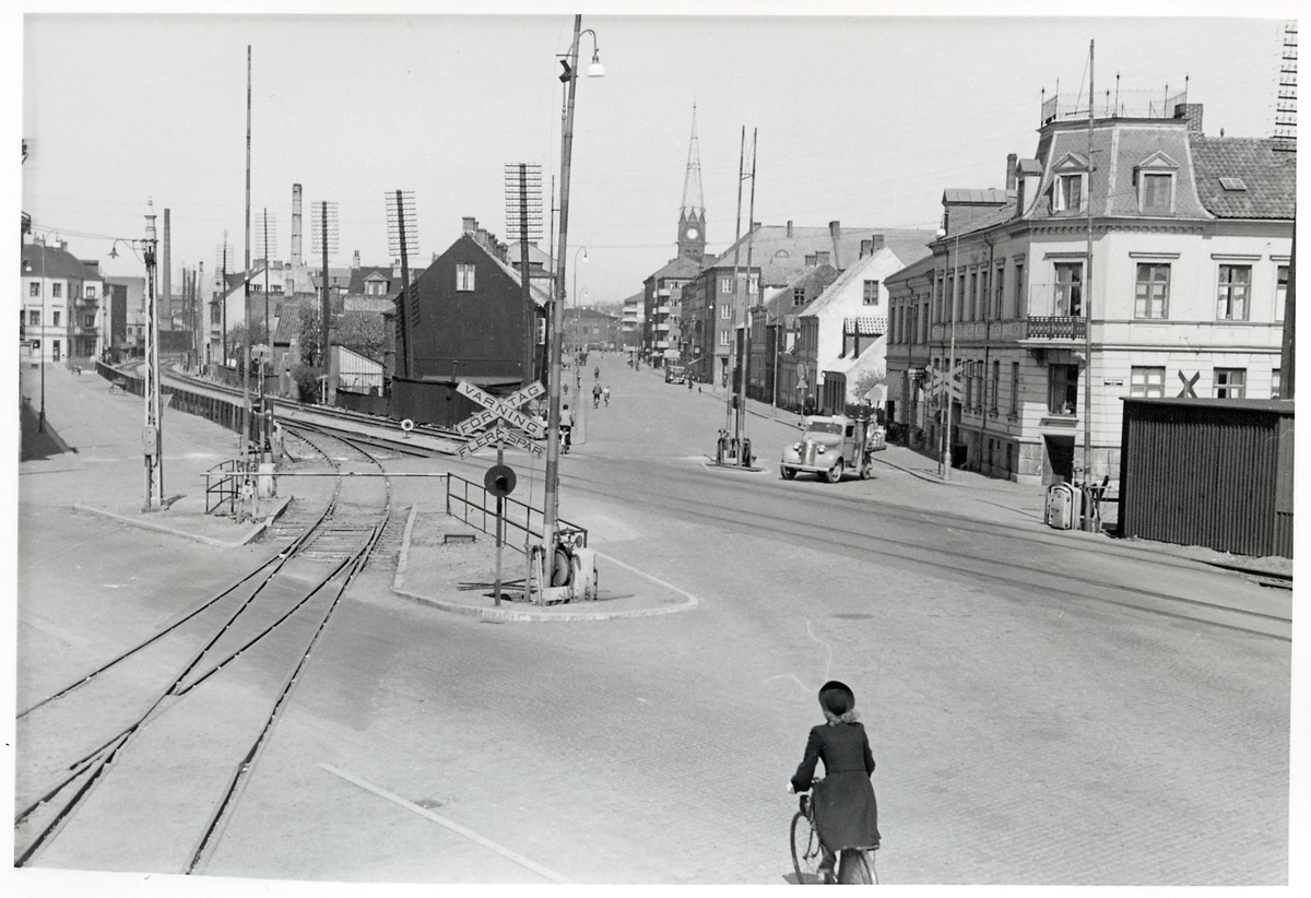 Järnvägsövergång i stadsmiljö med kyrktorn i bakgrunden.