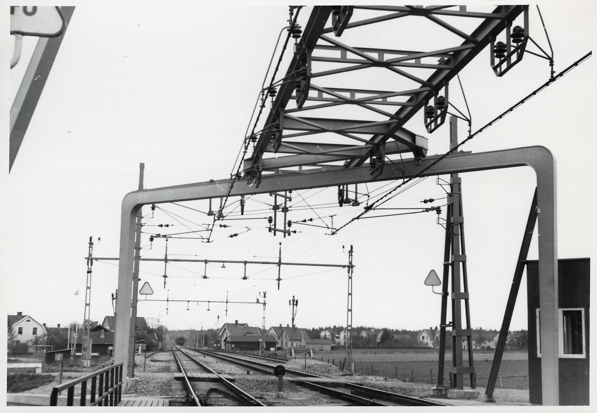 Den dubbelspåriga klaffbron över Göta kanal i järnvägstrafikläge.