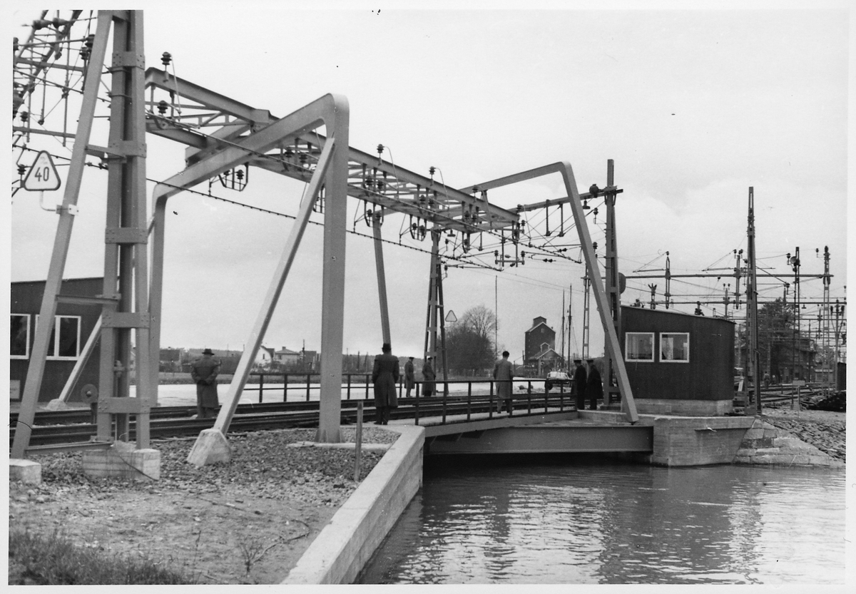 Den dubbelspåriga klaffbron över Göta kanal i järnvägstrafikläge.