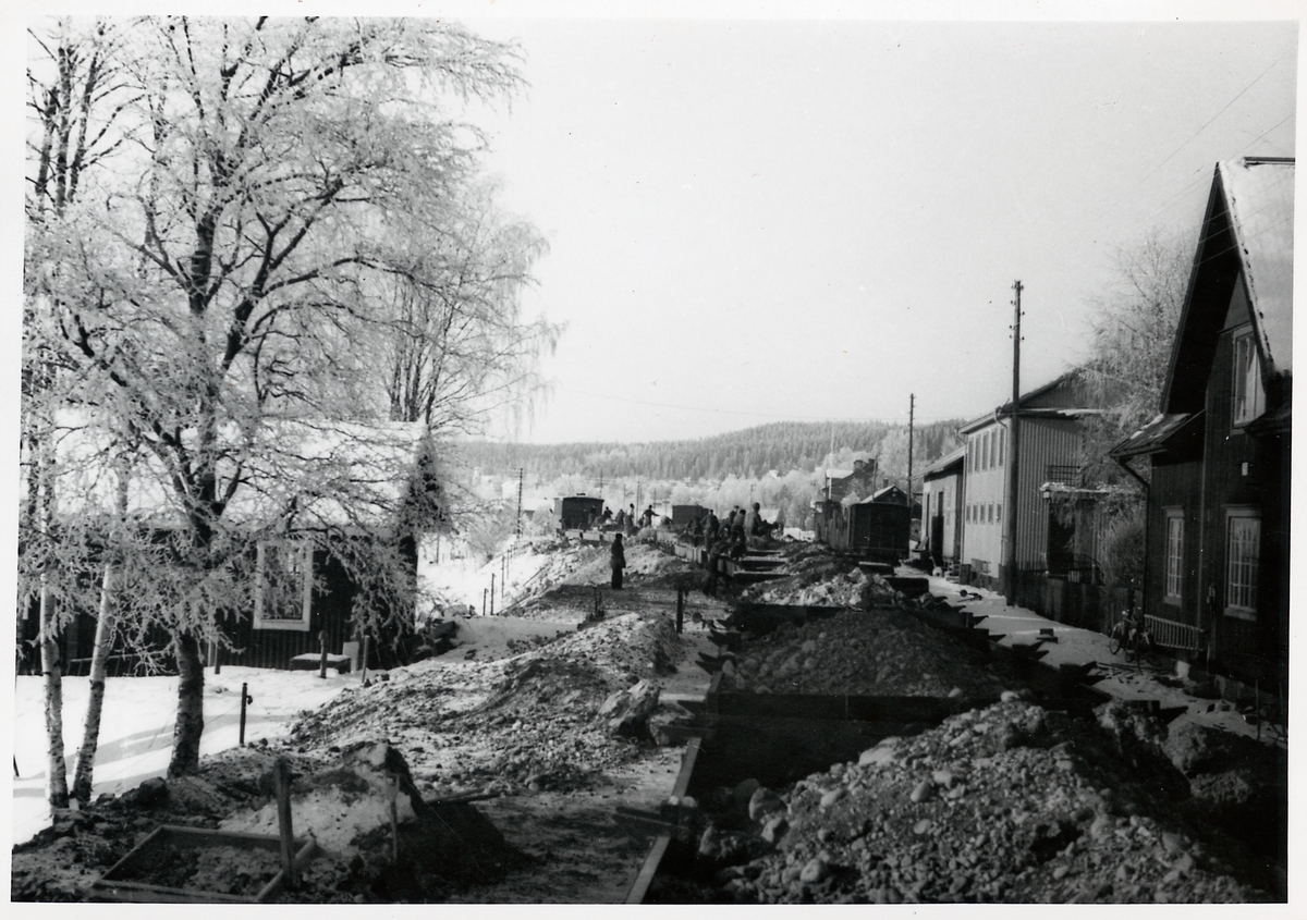 Morsil station mot vänster. Grusransportvagnar, banarbete med grustömning på bangården.