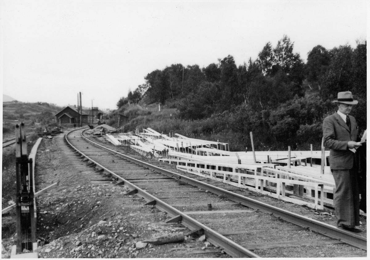 Elektrifieringen av järnvägen i Storlien. Kontaktledninstolpar ligger längs med spåret.