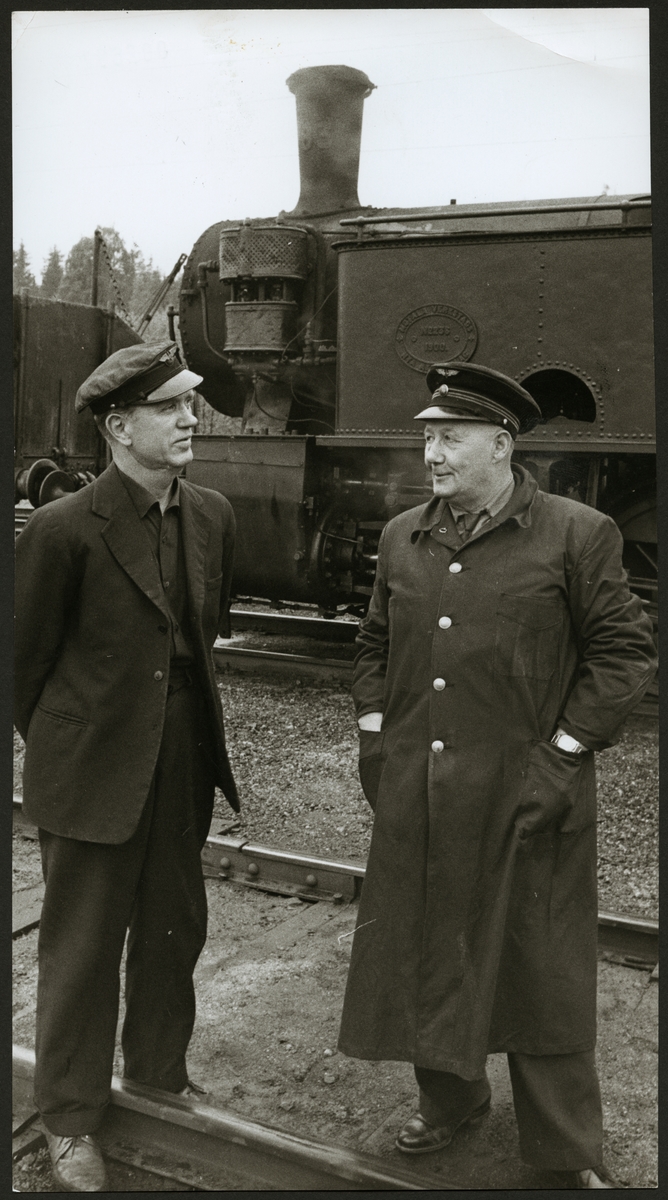 Lokförare E.H. Persson och lokbiträde Ture Prytz framför ett tanklok från Motala verkstad tillverkningsnummer 235.