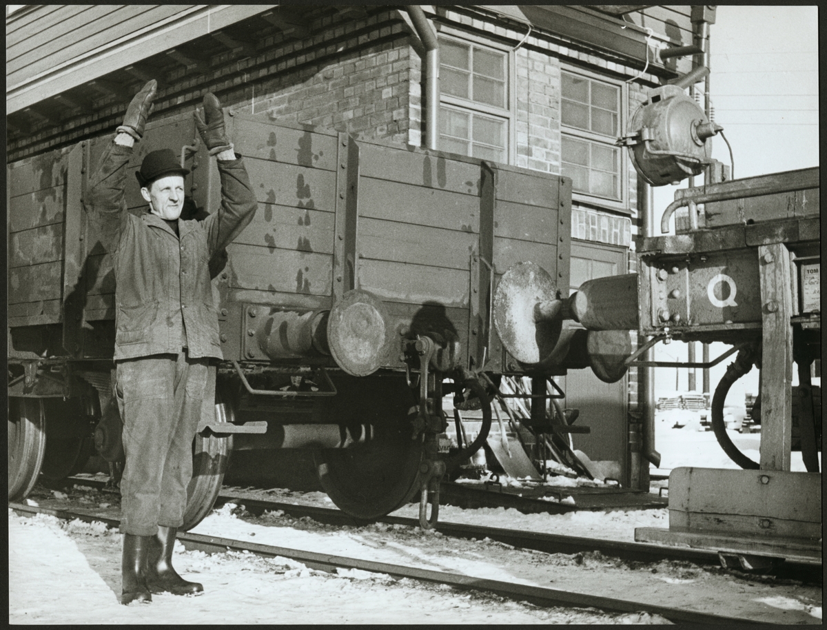 Ställverket vid Grängesbergs malmbangård med godsvagn framför.