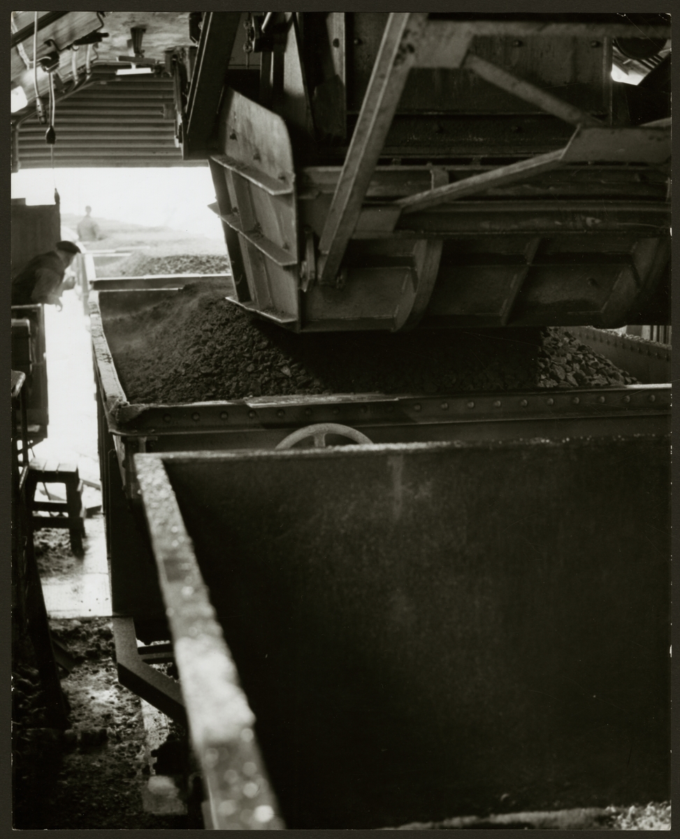 Halvautomatisk lastning av malm i malmvagnar vid Grängesbergs malmbangård.