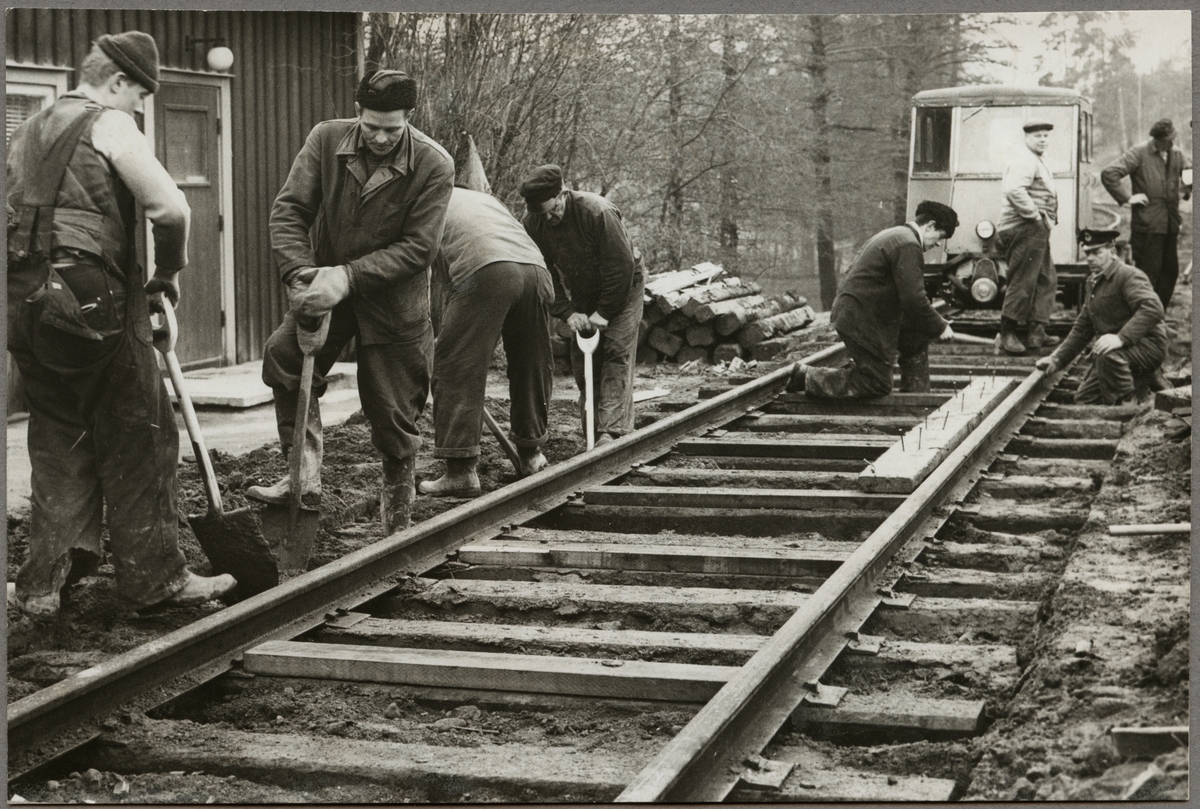 Arbete med att byta räls på linjen mellan Eskilstuna och Nybybruk 1960.