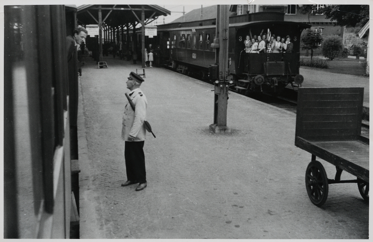En tågresenär i samspråk med en stationsinspektor, samt ett gäng glada flickor ombord på Göteborg Borås Järnvägar, GBJ, tredje klass personvagn.