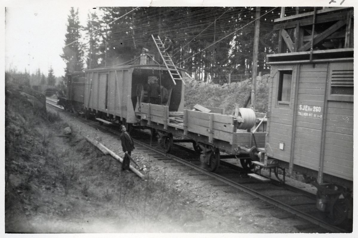 Ledningsmontage av linje inför Elektrifiering, Katrineholm - Åby. Statens Järnvägar SJ E 260.
