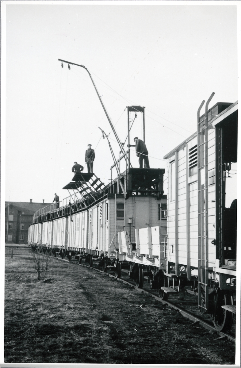 Ledningsmontage av linje inför elektrifiering. Montagetåg.
