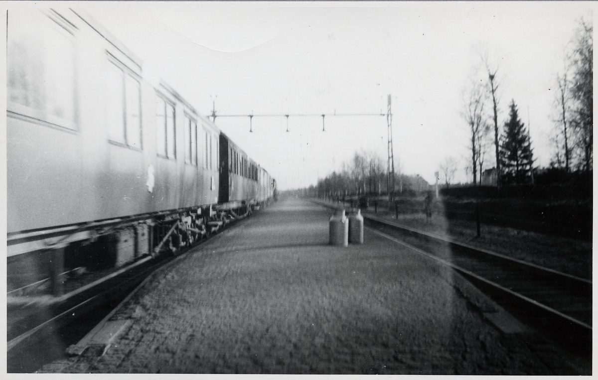 Två stycken mjölktunnor intill spåren, på linjen Tranås - Nässjö.