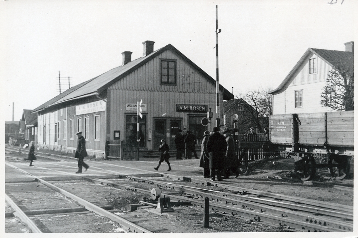 Folksamling utanför en av affärerna belägen inom stationsområdet i Sävsjö.