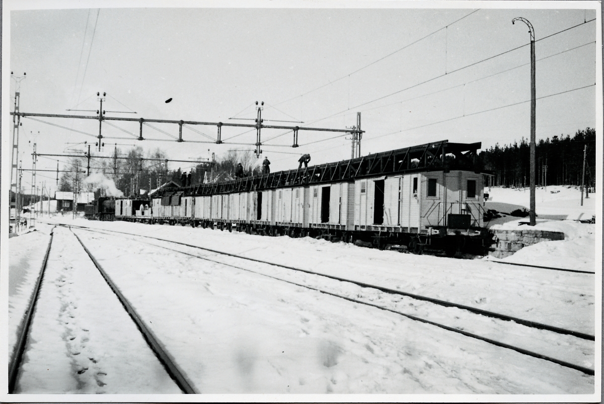 Titel: Ledningsmontage av linje inför elektrifiering. Montagetåg.