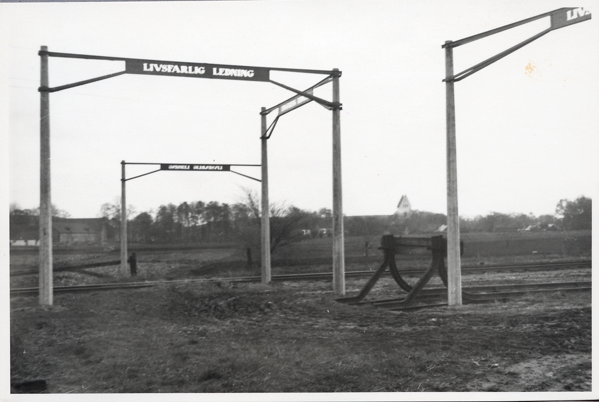 Varningsaskylt för kontaktledning.