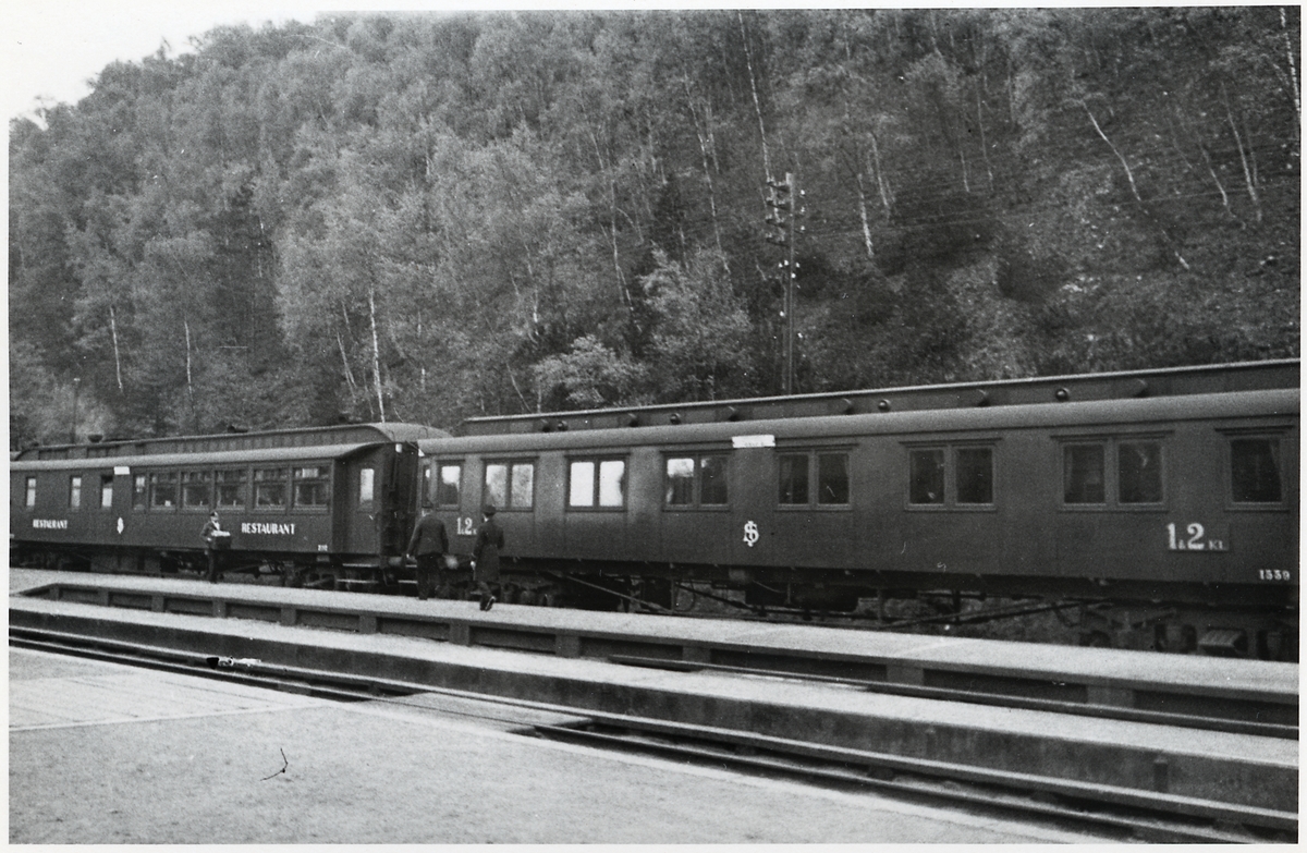 Statens järnvägar, SJ A01b 1339 och Restaurangvagn SJ ABo3a 2702. Här vid Båstad Södra järnvägsstation.