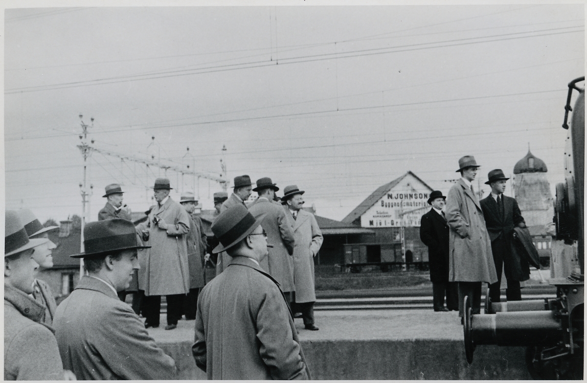 Titel: Järnvägstjänstemän på besök vid station.