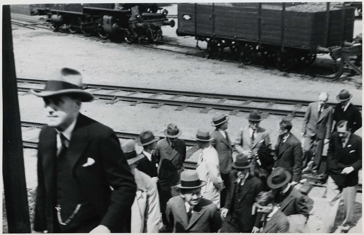 Titel: Järnvägstjänstemän på besök vid station.Järnvägstjänstemän på besök vid station.