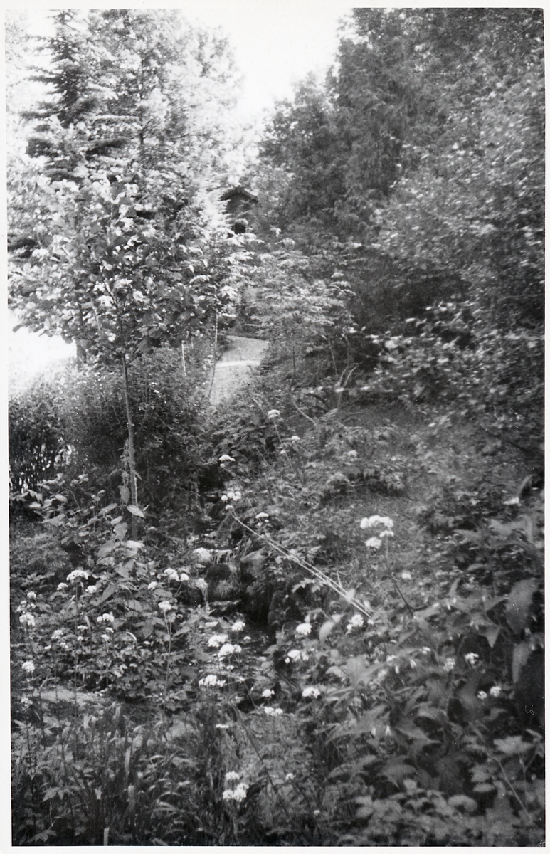 Titel: I förgrunden en liten bäck. Bakom buskagen skymtas en byggnad och trädgård.