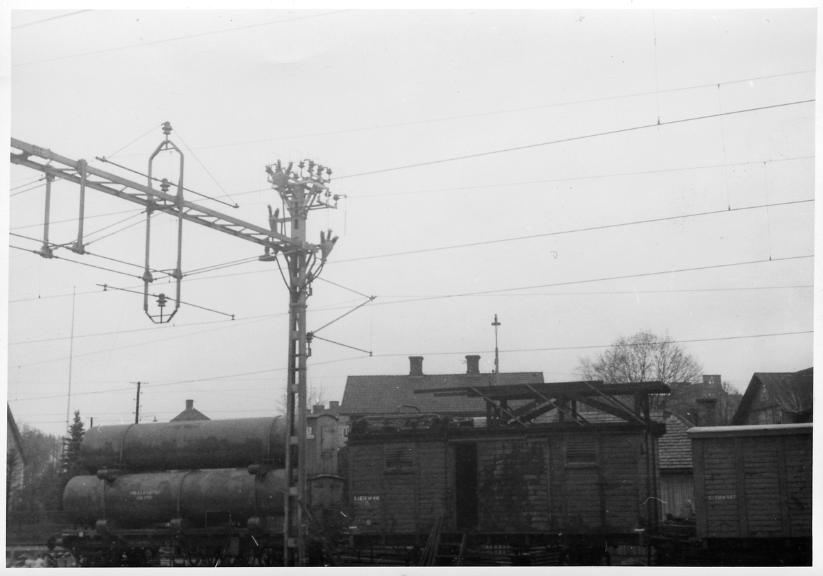 Kontaktledningsbrygga. Vagnarna är från vänster en gasvagn litt Statens Järnvägar, SJ Q4 och två fd Gm-vagnar som elförrådet Efd disponerar.