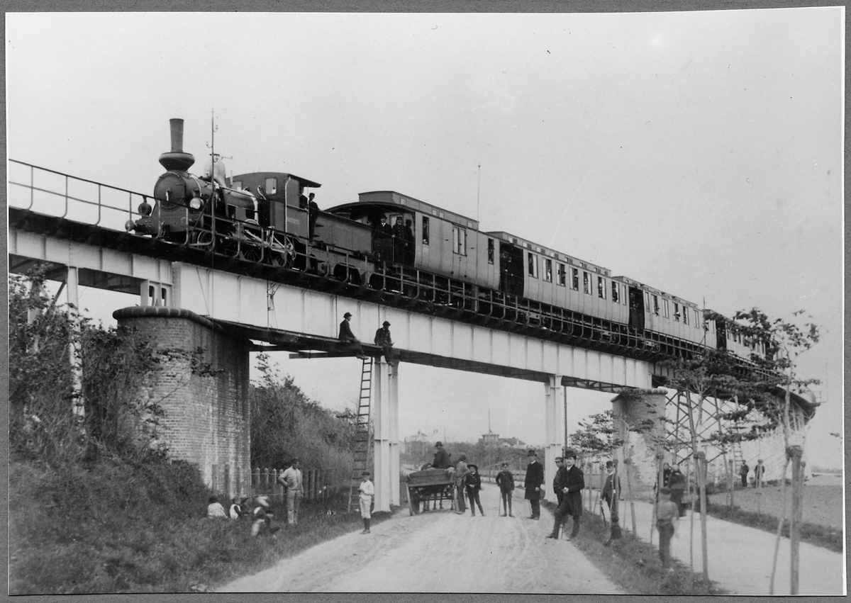 Viadukt vid Helsingborg med persontåg. Skåne Halands Järnvägar, SHJ lok 5 "Engeltofta", tillverkat 1884 av Nohab. 1896 såldes loket till Statens Järnvägar och fick littera
