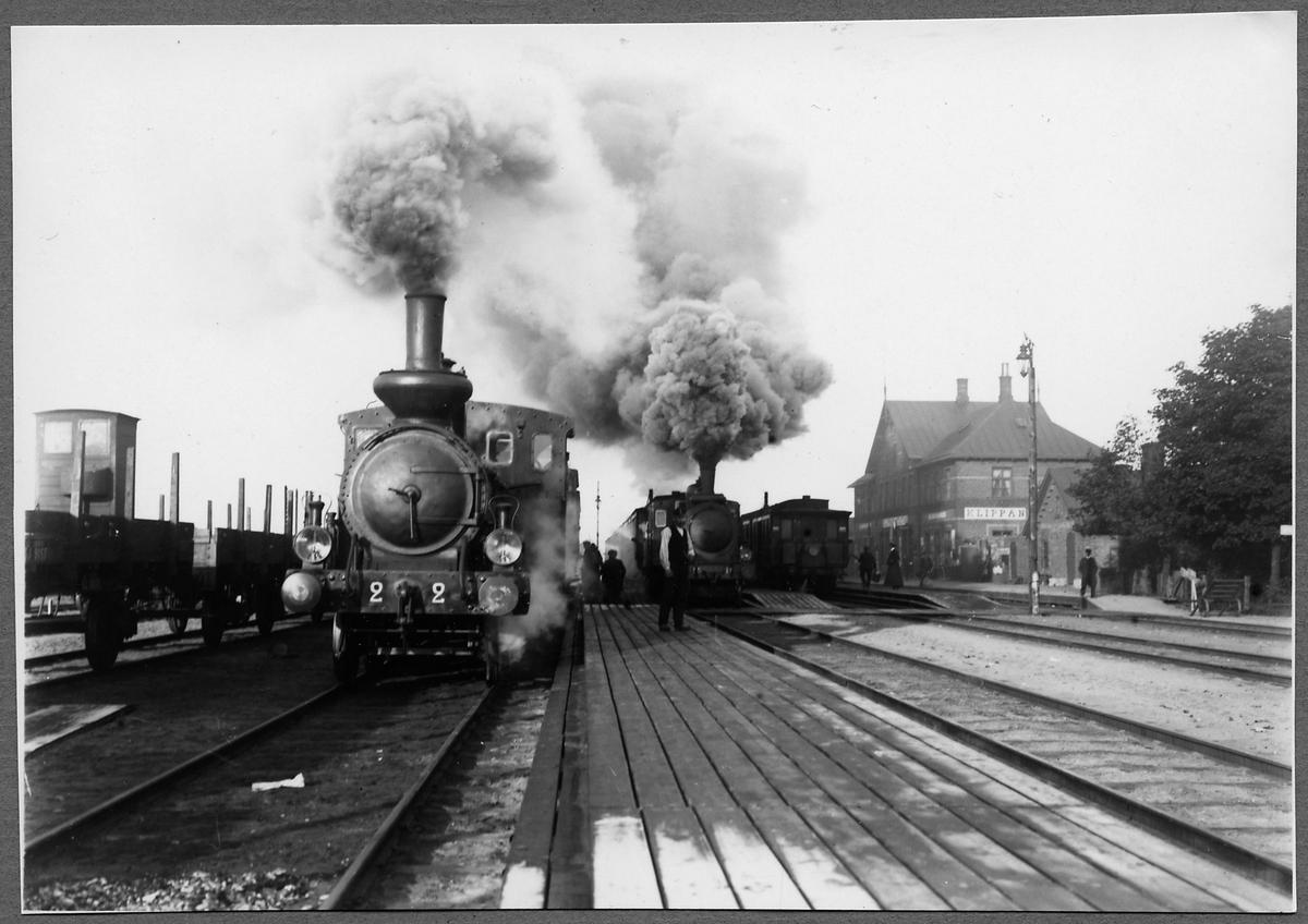 Klippan järnvägsstation. Ånglok som syns framme är Helsingborg - Hässleholms Järnvägar, HHJ lok 2, första littera var HHJ lok 4 "Bjuf". Loket tillverkades 1874 av Beyer Peacock & Co. Det skrotades 1935. Det andra loket är HHJ C2 16 "Prestorp", tillverkat 1899 av Atlas, skrotat 1944.