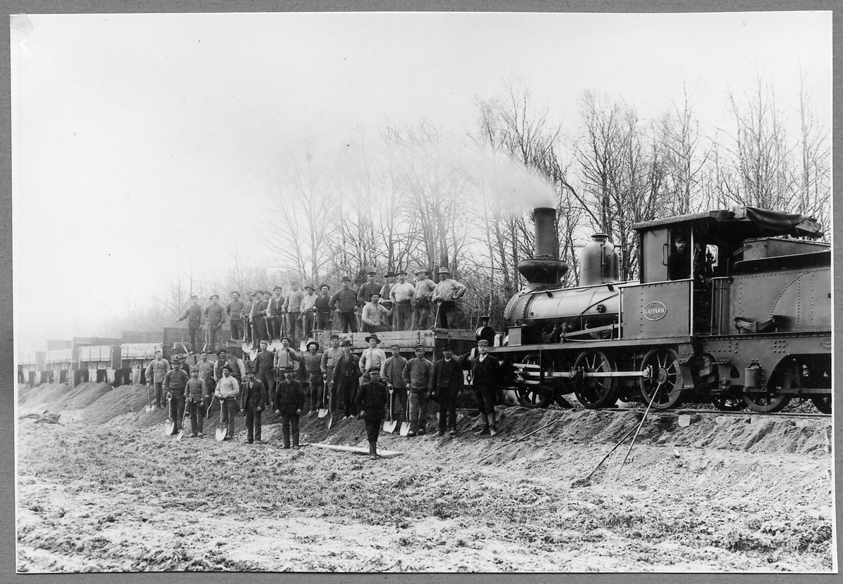 Gruståg med banarbetare. Grusning på linjen mellan Röstånga och Eslöv. Ånglok, Helsingborg - Hässleholms Järnvägar, HHJ lok 5, första littera var HHJ lok 1 "Kärnan". Loket tillverkades 1873 av Black Hawthorn & Co. Det skrotades 1927.