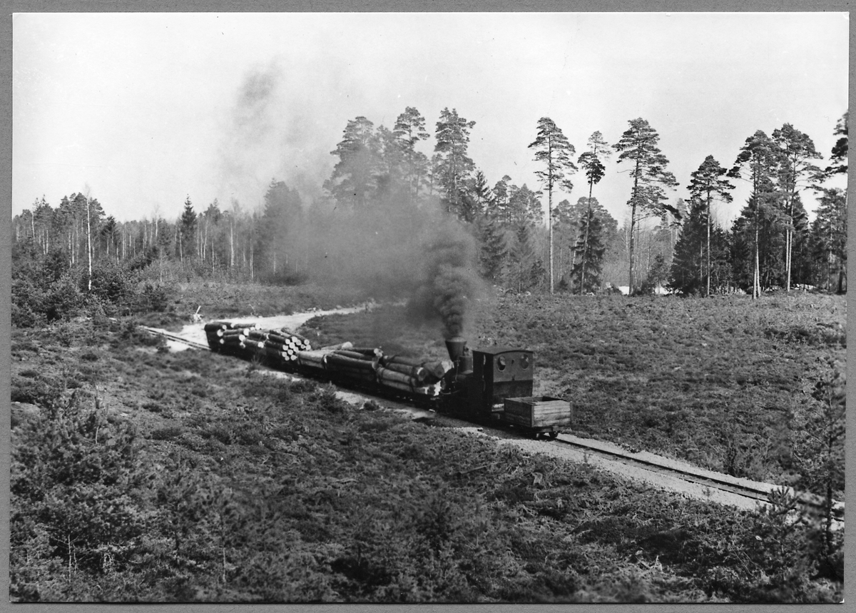 Domänverket Böda lok 1 "Mormor" med sju koppel timmer. Bödabanan, Böda kronopark.